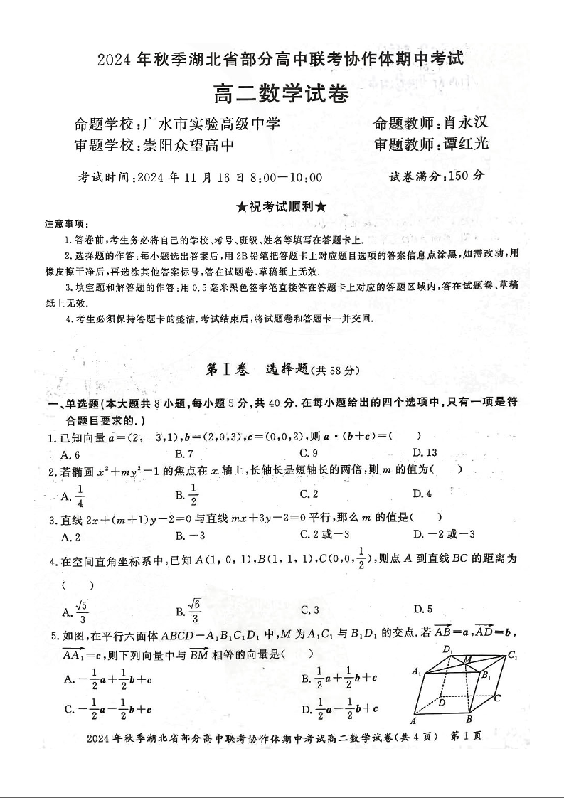 2024年湖北部分名校高二期中联考 数学