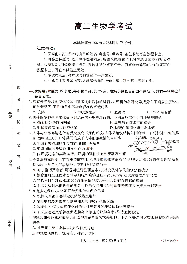 内蒙古赤峰市名校2024-2025学年高二上学期期中联考 生物