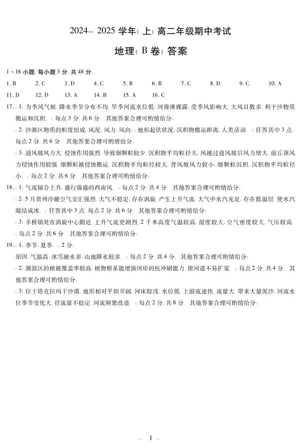 河南省部分学校2024-2025学年高二上学期11月期中考试 地理答案