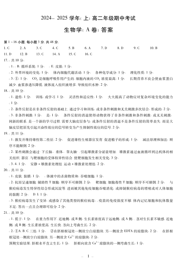 河南省部分学校2024-2025学年高二上学期11月期中考试 生物答案