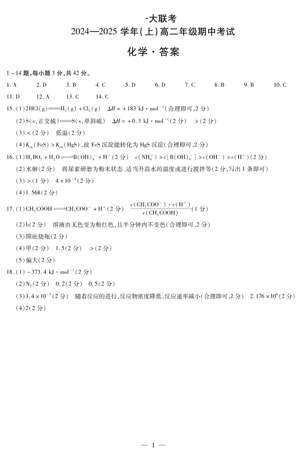 河南省部分学校2024-2025学年高二上学期11月期中考试 化学答案