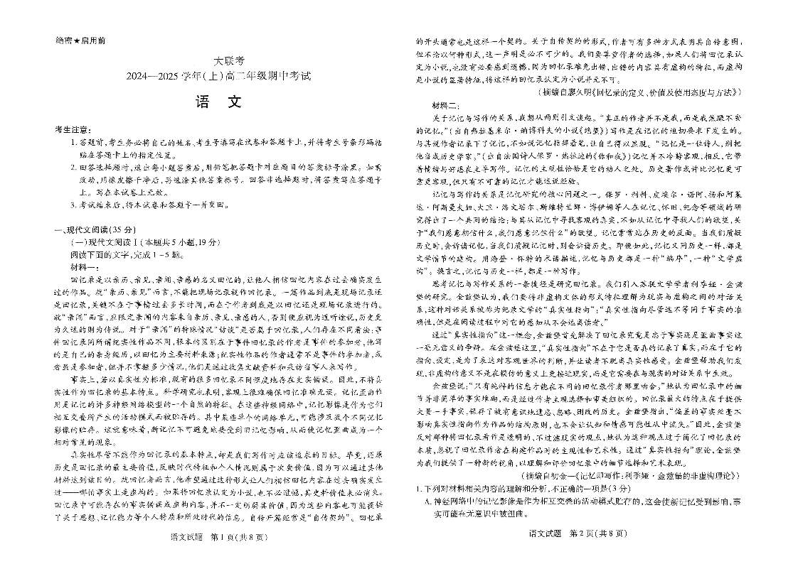 河南省部分学校2024-2025学年高二上学期11月期中考试 语文