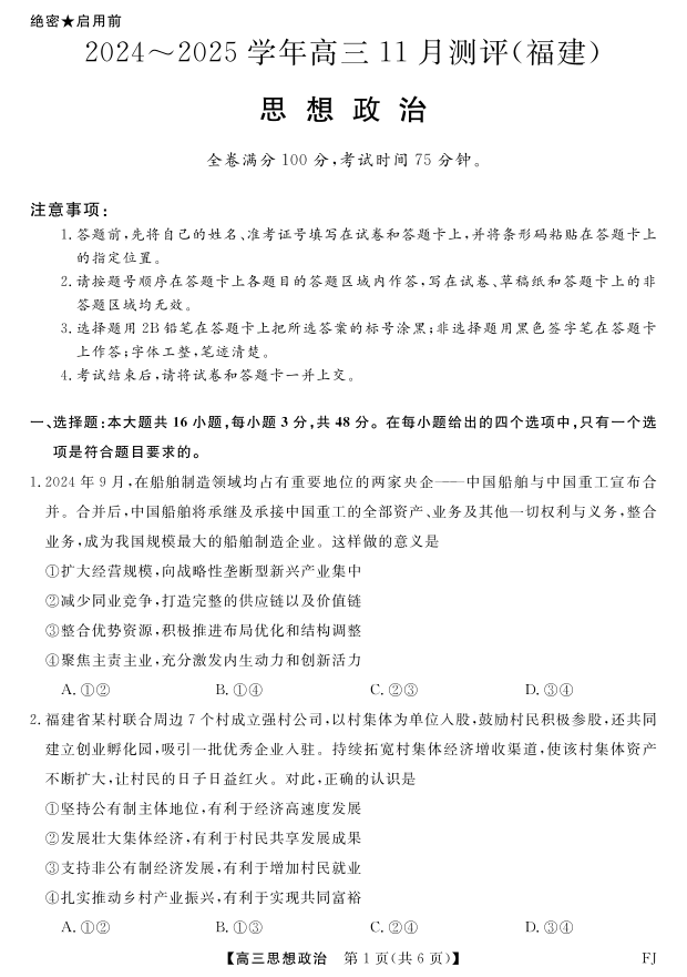 福建省2024-2025学年金科大联考高三11月测评 政治