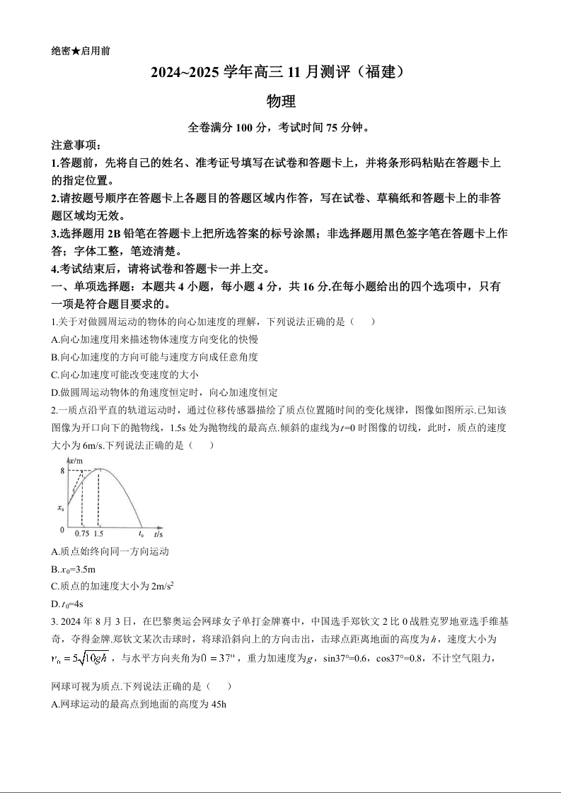 福建省2024-2025学年金科大联考高三11月测评 物理