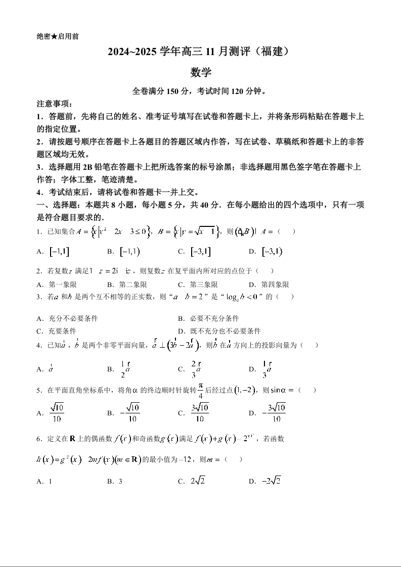 福建省2024-2025学年金科大联考高三11月测评 数学