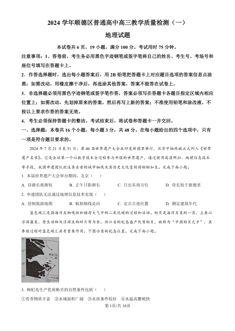 广东省佛山市2024学年顺德区普通高中高三教学质量检测(一) 地理