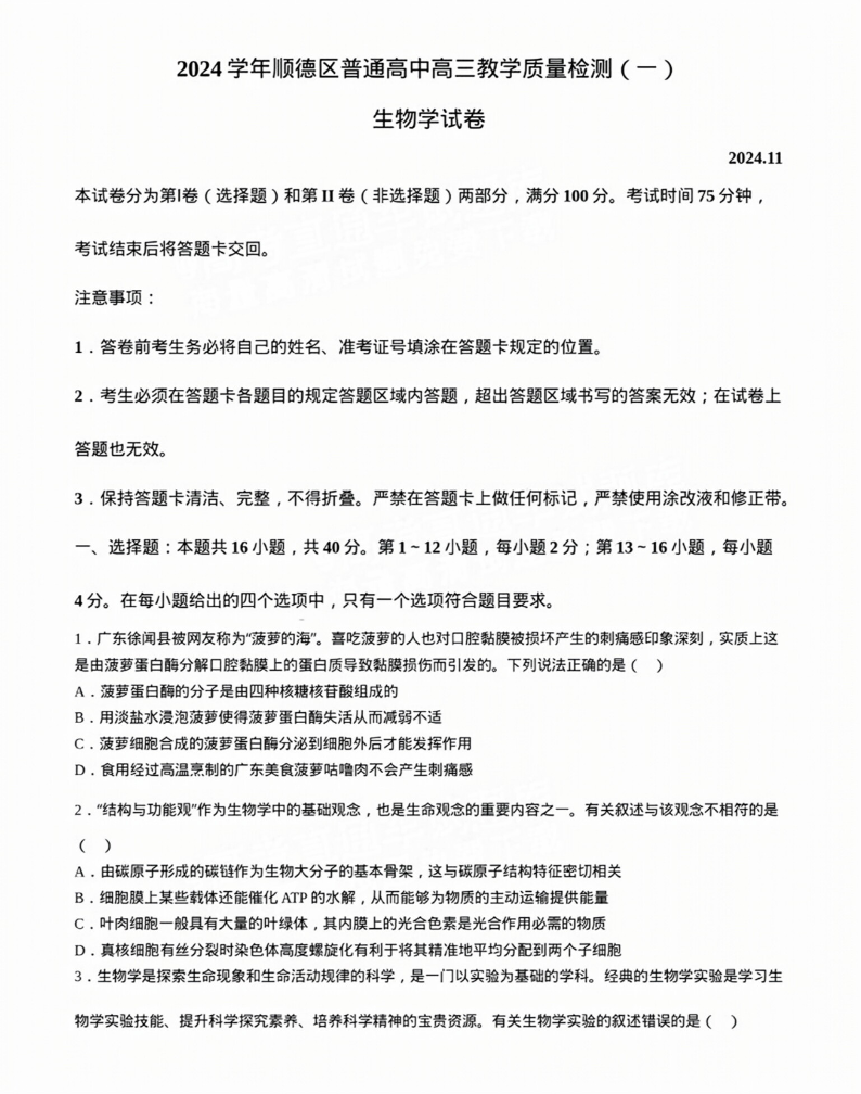广东省佛山市2024学年顺德区普通高中高三教学质量检测(一) 生物