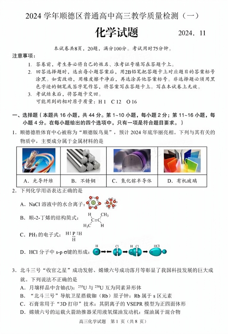 广东省佛山市2024学年顺德区普通高中高三教学质量检测(一) 化学
