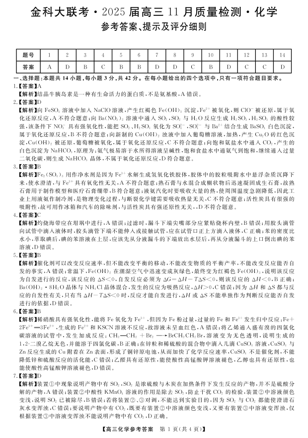 河南省金科新未来大联考2025届高三上学期11月质量检测 化学答案