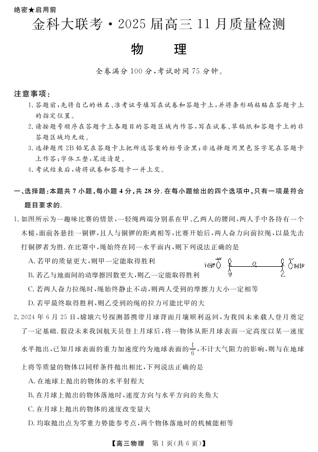 河南省金科新未来大联考2025届高三上学期11月质量检测 物理