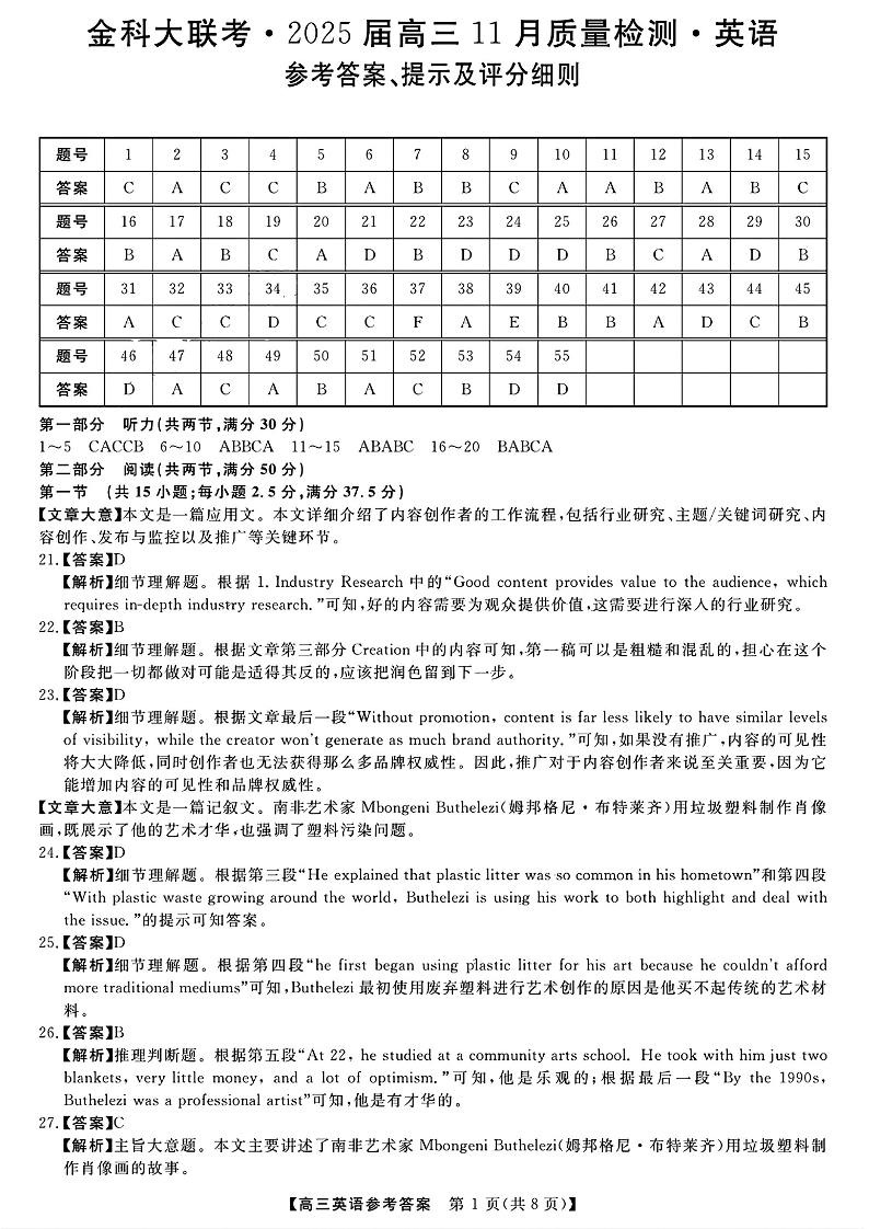 河南省金科新未来大联考2025届高三上学期11月质量检测 英语答案