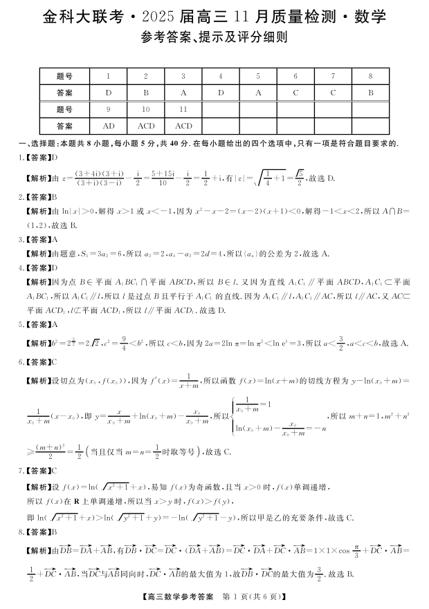 河南省金科新未来大联考2025届高三上学期11月质量检测 数学答案