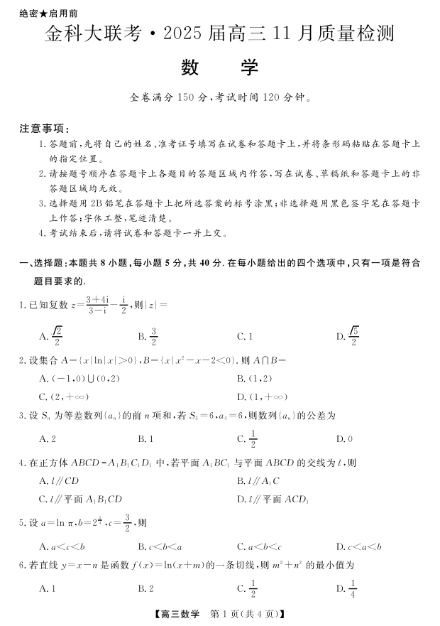 河南省金科新未来大联考2025届高三上学期11月质量检测 数学