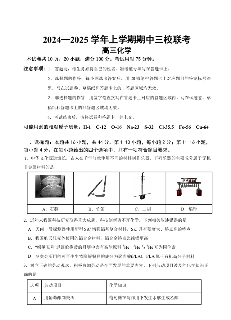 广东省广州外国语、广大附中、铁一中学2024—2025学年高三第一学期期中三校联考 化学