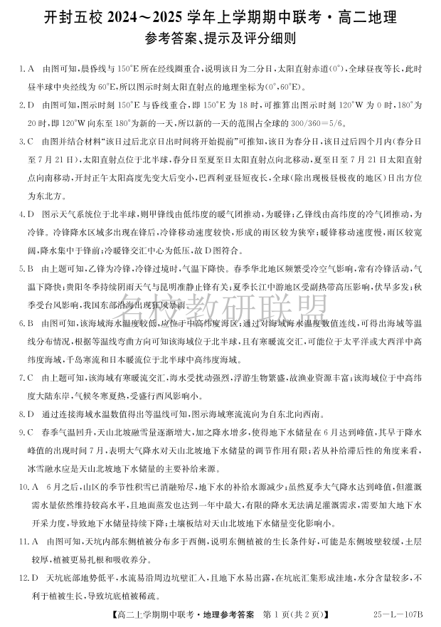 河南省开封五校2024-2025学年高二11月期中联考 地理答案
