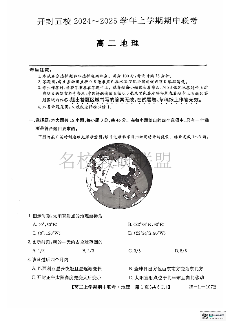 河南省开封五校2024-2025学年高二11月期中联考 地理