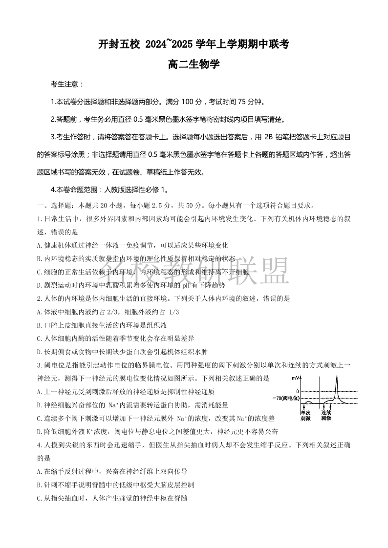 河南省开封五校2024-2025学年高二11月期中联考 生物