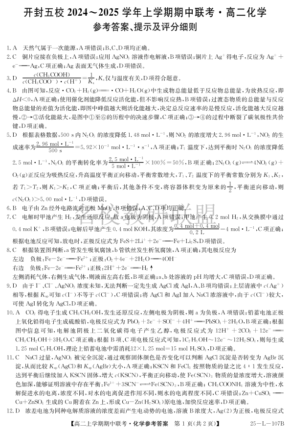 河南省开封五校2024-2025学年高二11月期中联考 化学答案