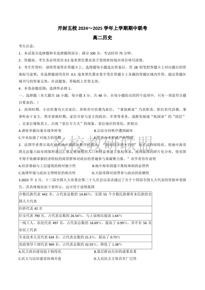 河南省开封五校2024-2025学年高二11月期中联考 历史