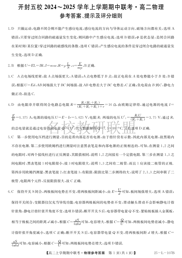 河南省开封五校2024-2025学年高二11月期中联考 物理答案