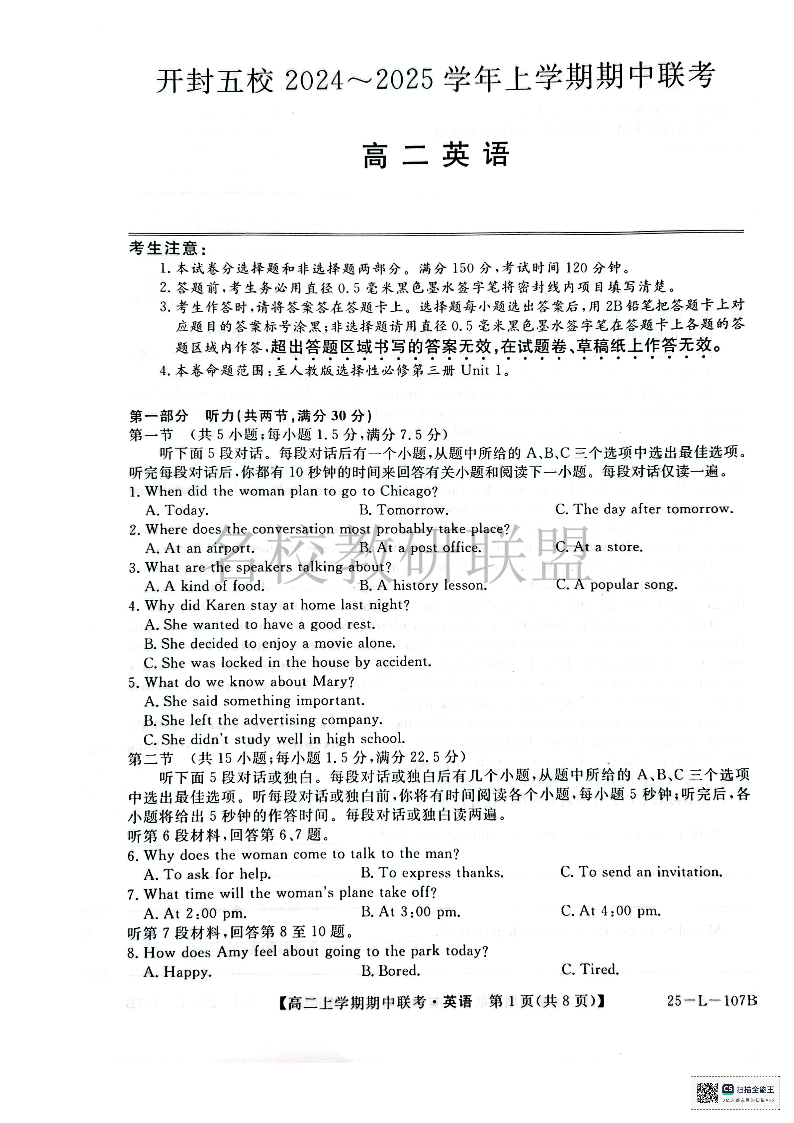 河南省开封五校2024-2025学年高二11月期中联考 英语