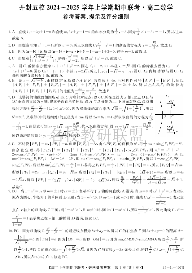 河南省开封五校2024-2025学年高二11月期中联考 数学答案
