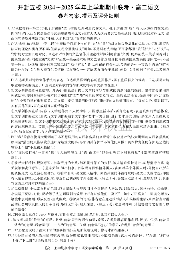 河南省开封五校2024-2025学年高二11月期中联考 语文答案