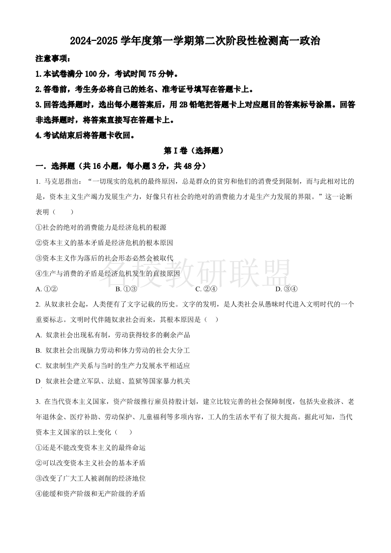 陕西省西安市部分学校联考2024-2025学年高一11月期中考试 政治
