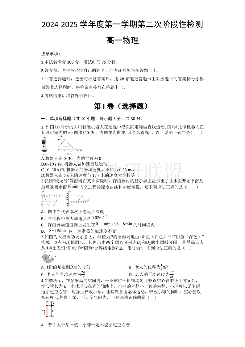 陕西省西安市部分学校联考2024-2025学年高一11月期中考试 物理