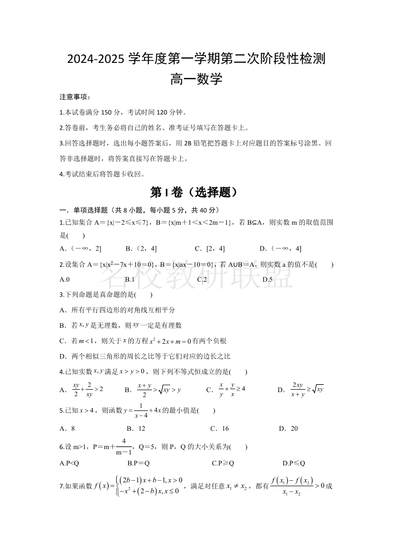 陕西省西安市部分学校联考2024-2025学年高一11月期中考试 数学
