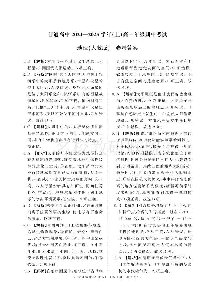 河南省青桐鸣普通高中2024-2025学年高一11月期中考试 地理答案