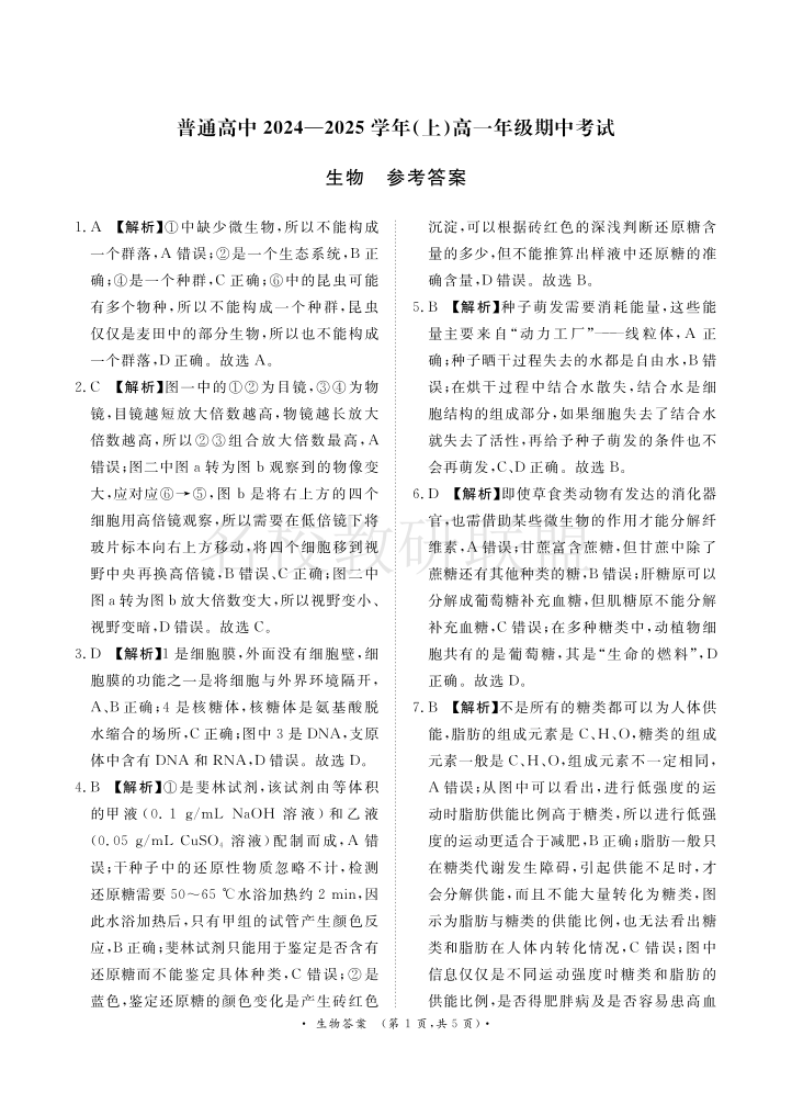 河南省青桐鸣普通高中2024-2025学年高一11月期中考试 生物答案