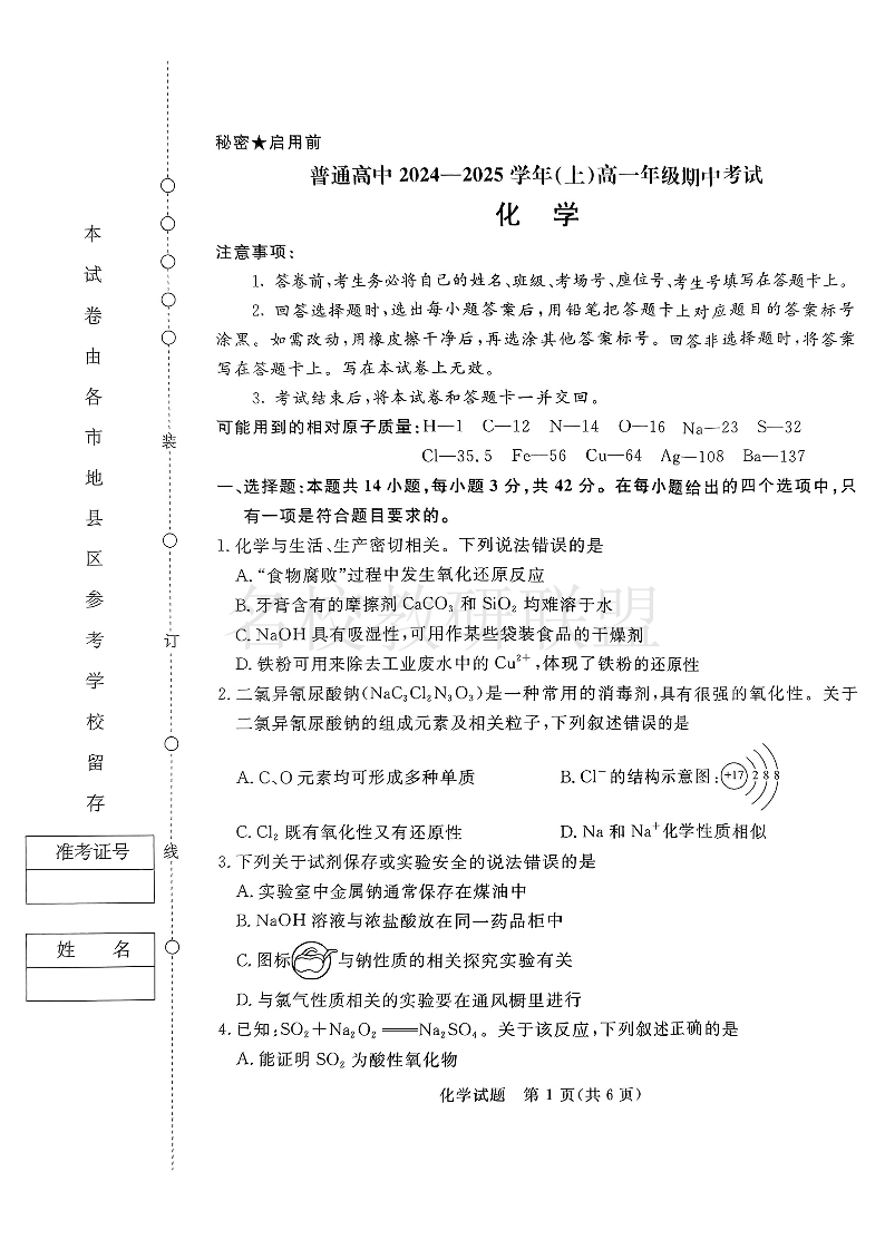 河南省青桐鸣普通高中2024-2025学年高一11月期中考试 化学