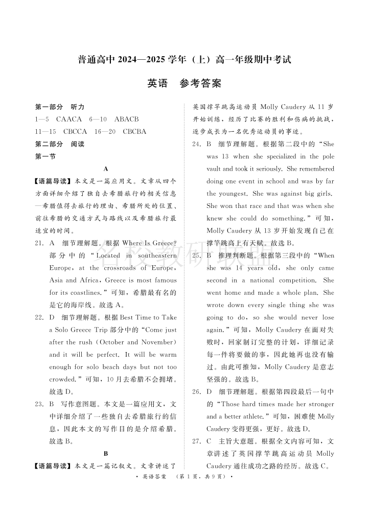 河南省青桐鸣普通高中2024-2025学年高一11月期中考试 英语答案