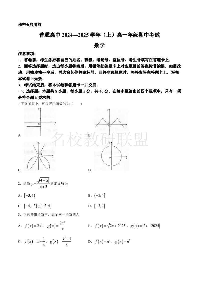 河南省青桐鸣普通高中2024-2025学年高一11月期中考试 数学
