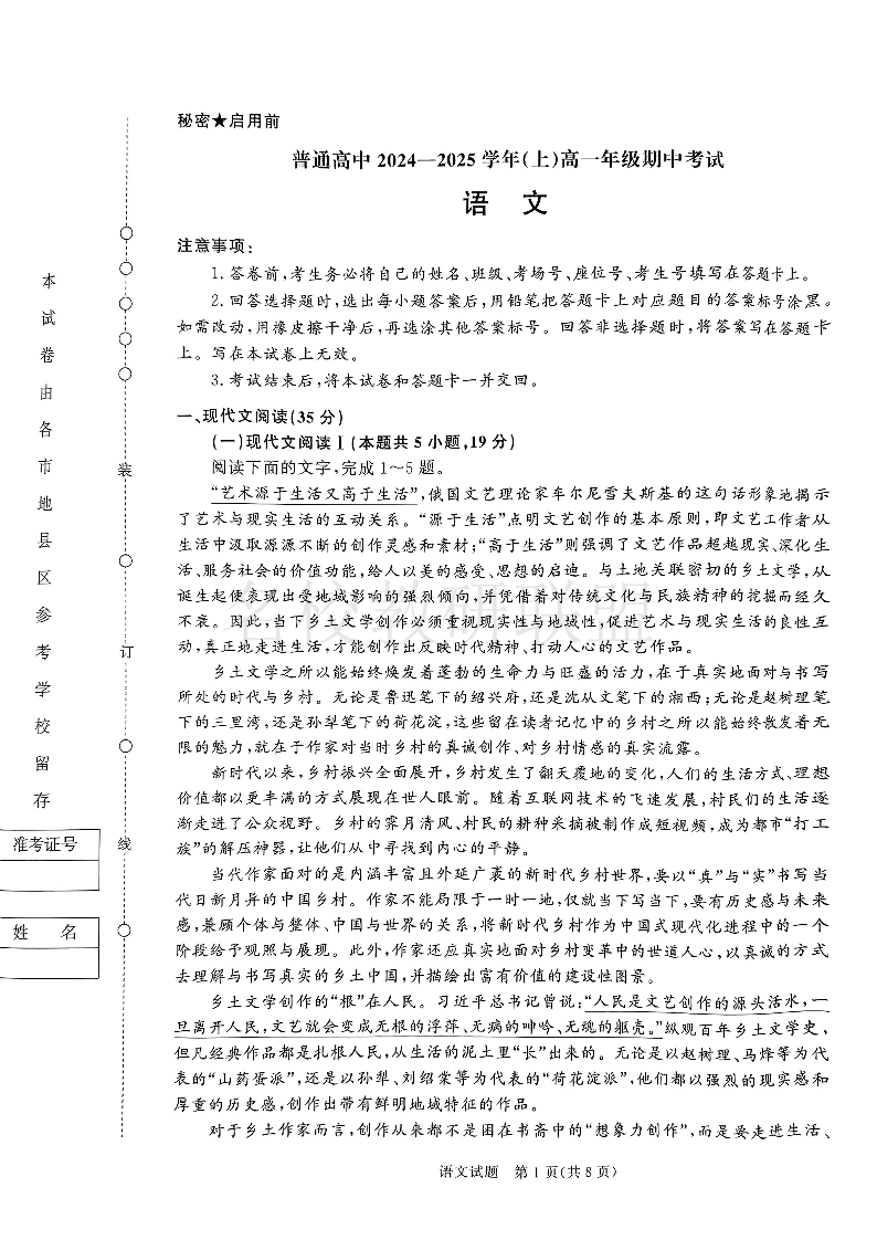 河南省青桐鸣普通高中2024-2025学年高一11月期中考试 语文