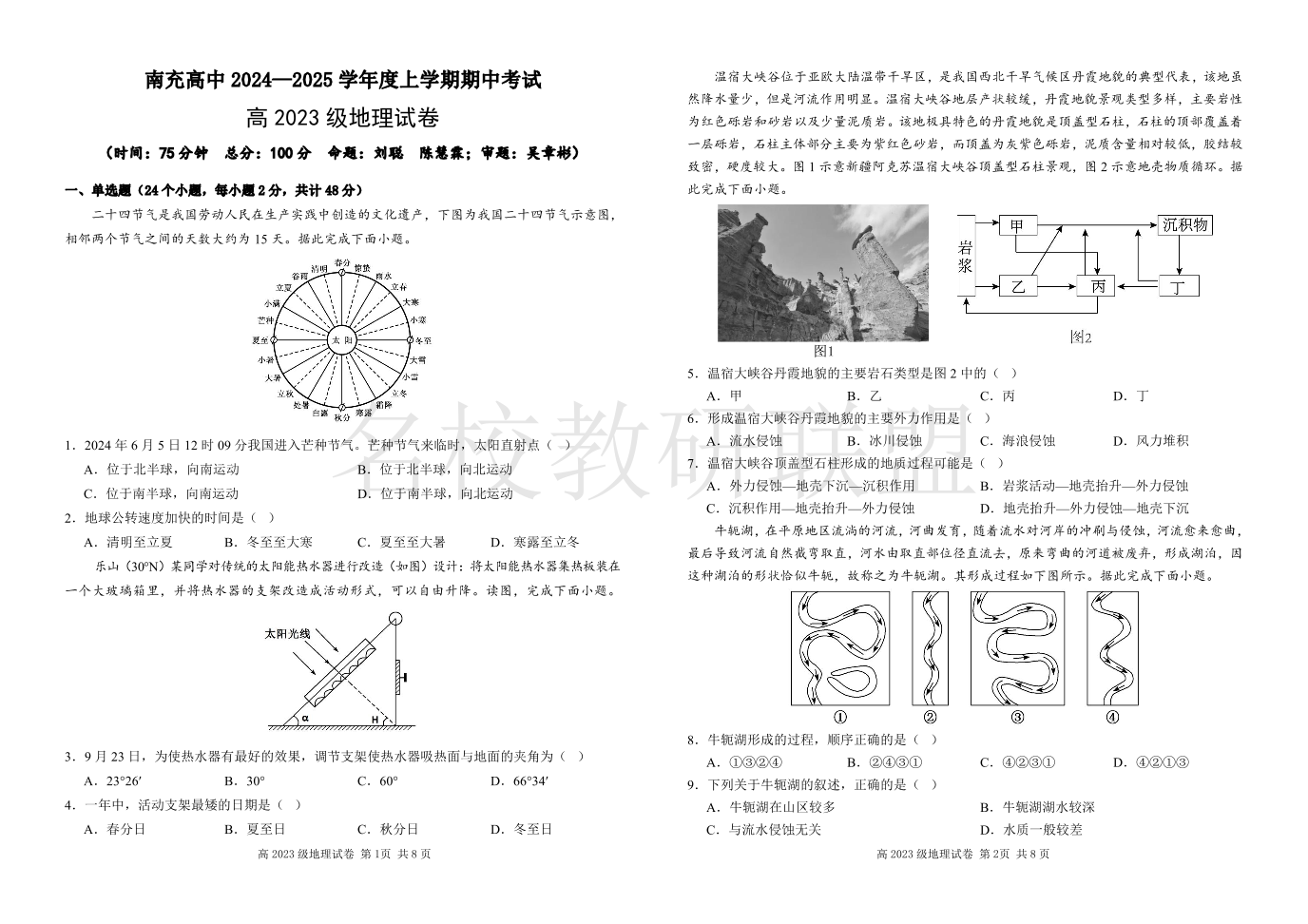 四川省南充高级中学2024-2025高二上学期期中考试 地理