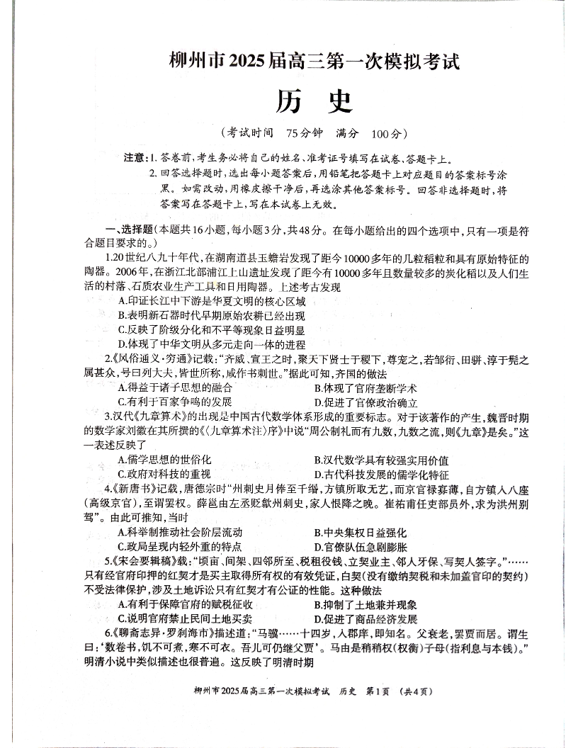 广西壮族自治区柳州市2025届高三第一次模拟考试 历史