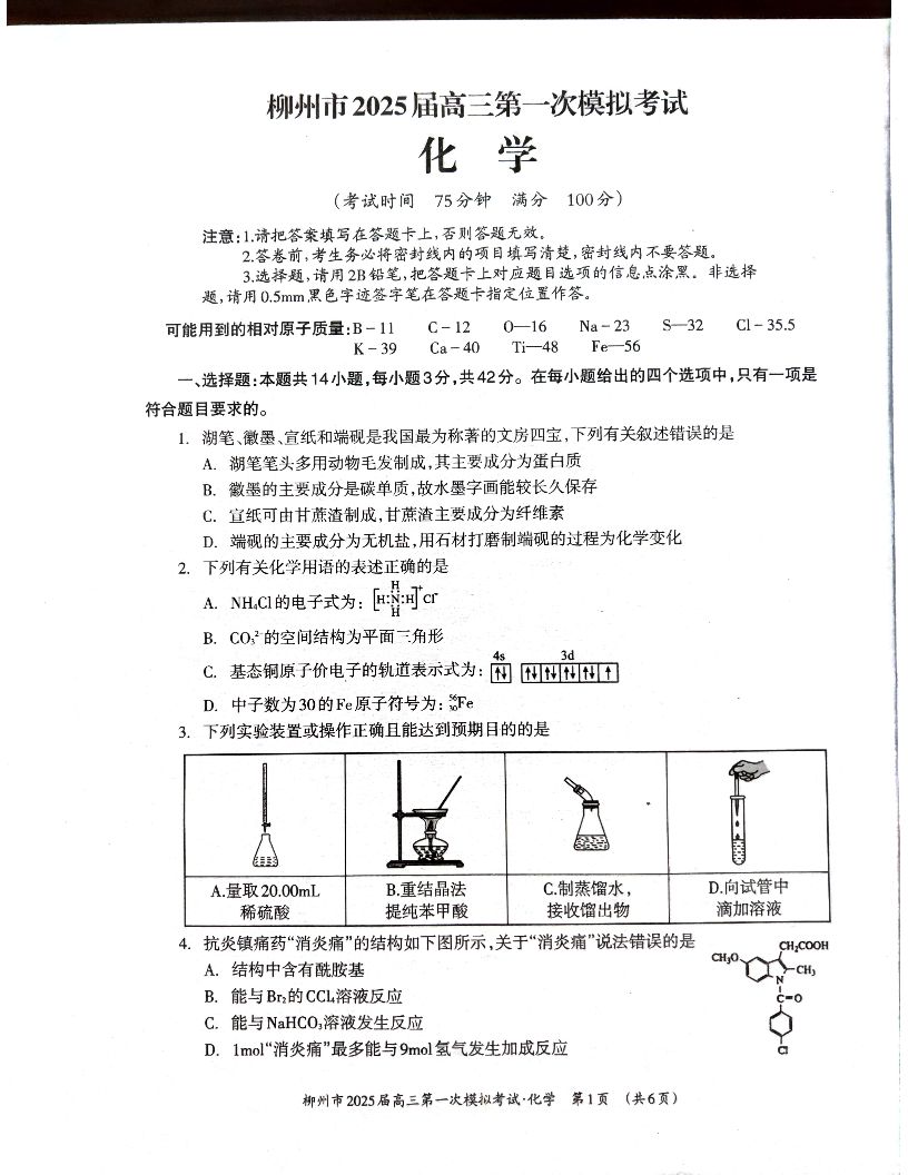 广西壮族自治区柳州市2025届高三第一次模拟考试 化学