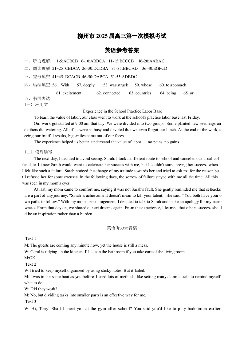 广西壮族自治区柳州市2025届高三第一次模拟考试 英语参考答案
