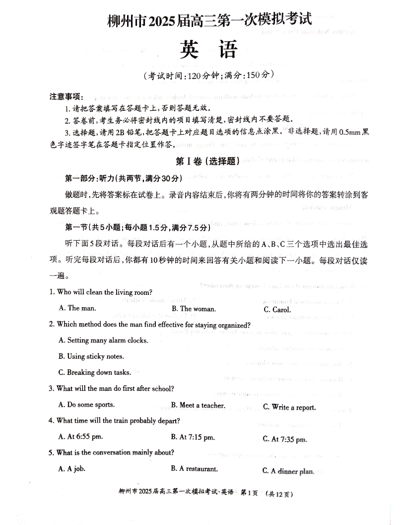 广西壮族自治区柳州市2025届高三第一次模拟考试 英语