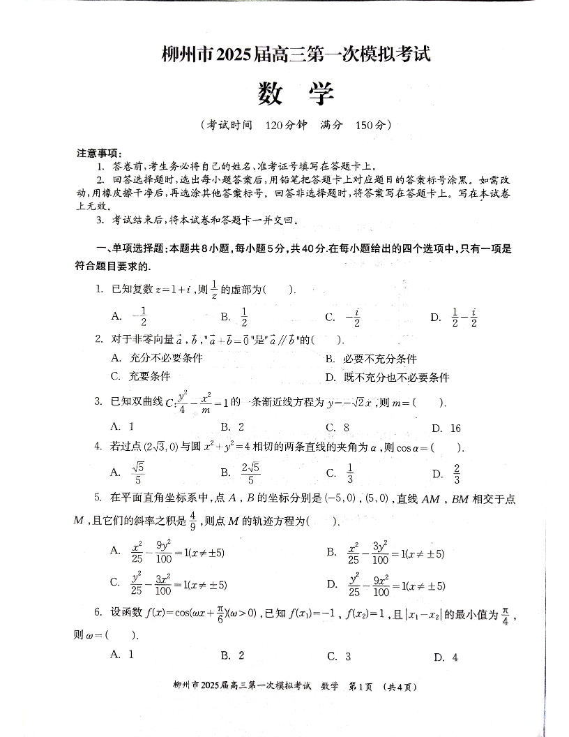 广西壮族自治区柳州市2025届高三第一次模拟考试 数学