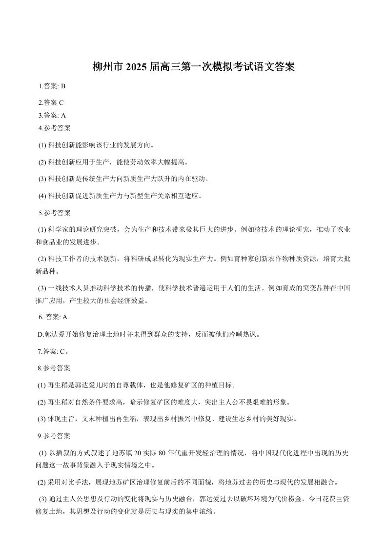 广西壮族自治区柳州市2025届高三第一次模拟考试 语文参考答案