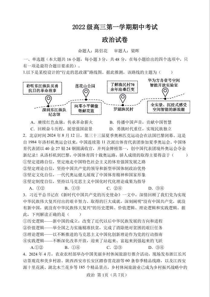汕头市金山中学2022级高三第一学期期中考试 政治
