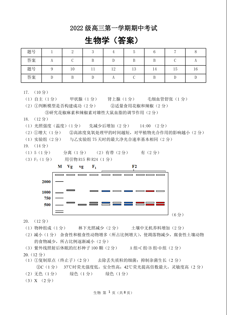 汕头市金山中学2022级高三第一学期期中考试 生物答案