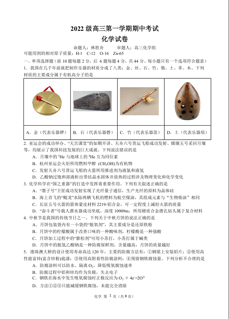 汕头市金山中学2022级高三第一学期期中考试 化学