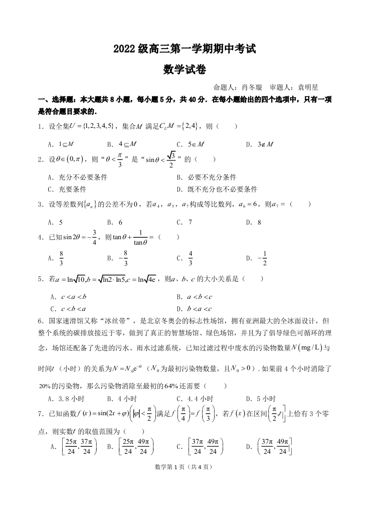 汕头市金山中学2022级高三第一学期期中考试 数学