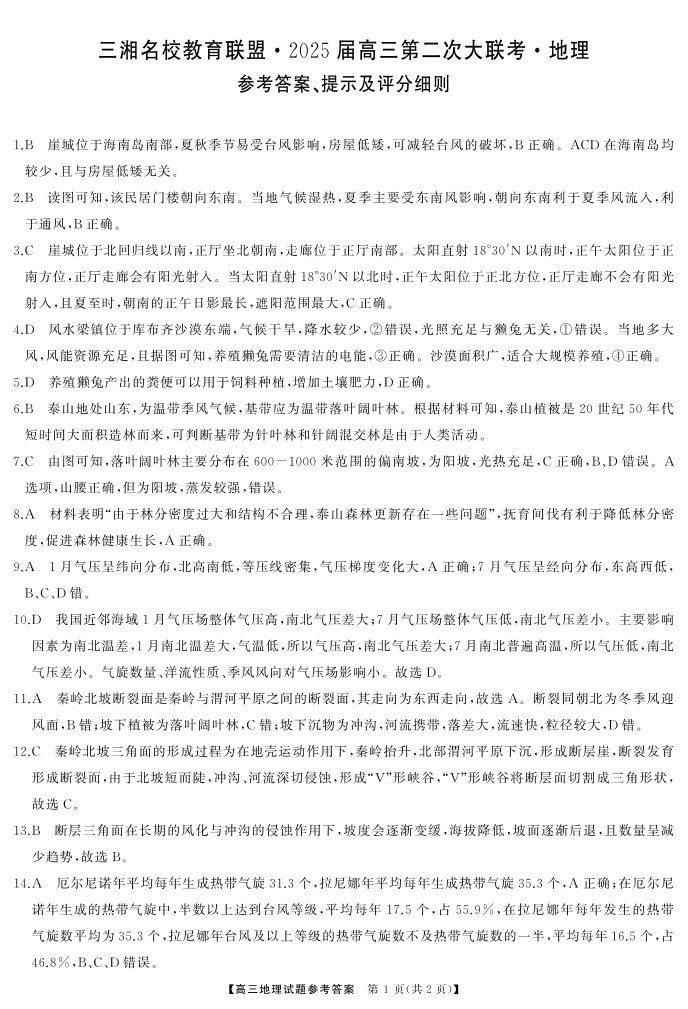 湖南省天壹名校联盟2025届高三高三第二次大联考 地理答案