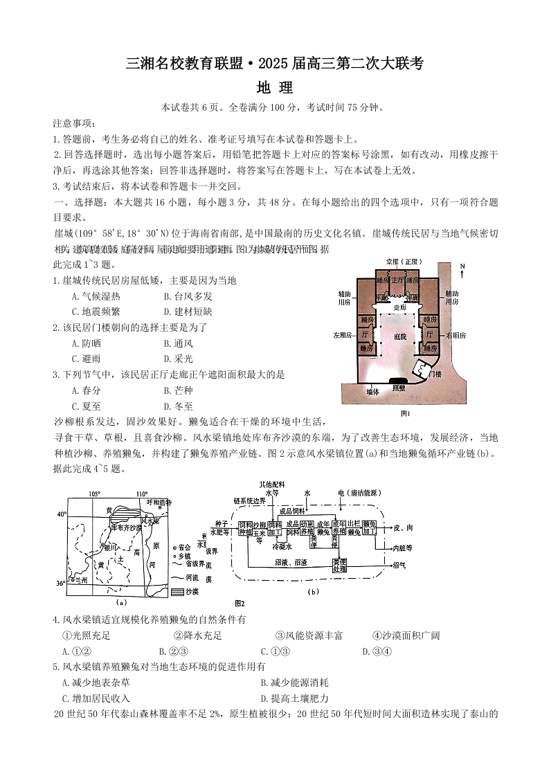 湖南省天壹名校联盟2025届高三高三第二次大联考 地理