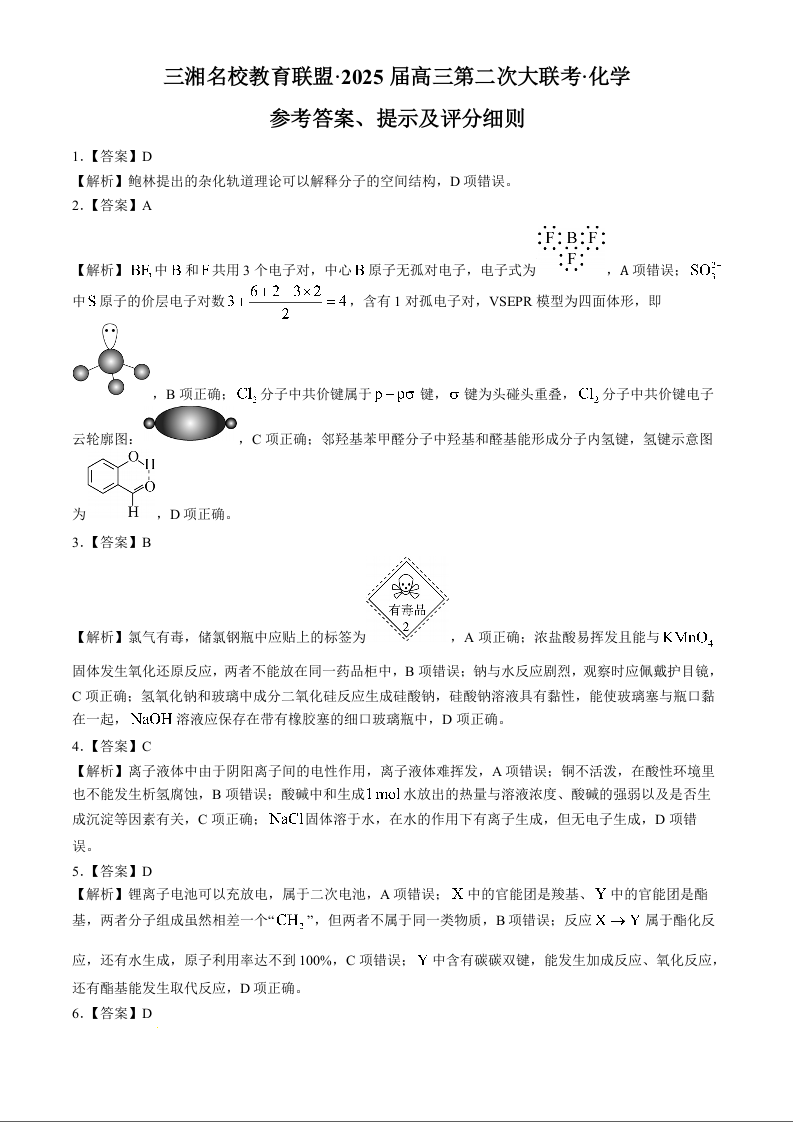 湖南省天壹名校联盟2025届高三高三第二次大联考 化学答案
